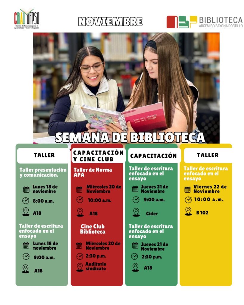 ¡No te pierdas nuestra Semana de Biblioteca! Del 18 al 22 de noviembre, tendremos una serie de talleres y capacitaciones que te ayudarán a fortalecer tus habilidades académicas y creativas. 🌟✍️